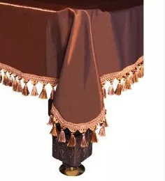 У нас в наличии есть покрывало для бильярдного стола размером в 8 футов. Это не влагостойкое покрывало, изготовленное из шелка, оно не пропускает сквозь себя пыль, грязь и воду. У покрывала коричневый цвет, это очень глубокий оттенок, который смотрится дорого и эстетично, он будет уместен в любом бильярдном помещении. По краю покрывала проходит бронзовая бахрома, которая делает его еще интереснее и богаче.