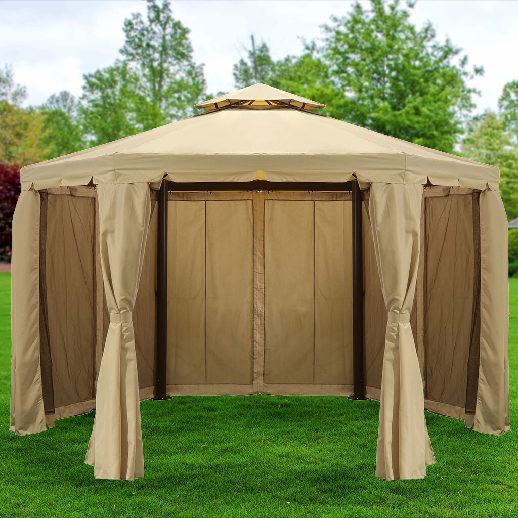 У нас вы можете приобрести комплект, предназначенный для шестиугольного шатра с двойной крышей Green Days. В данный комплект входит крыша с вентиляцией, а также москитная сетка. Данный комплект выполнен в сером цвете, изготовлен он в России. Подойдёт комплект для шатра, размер которого составляет 2 х 2 х 2,8 м. Крыша изготовлена из кровельной ткани полиэстер плотностью 250 г, обработанной поливинилхлоридом.