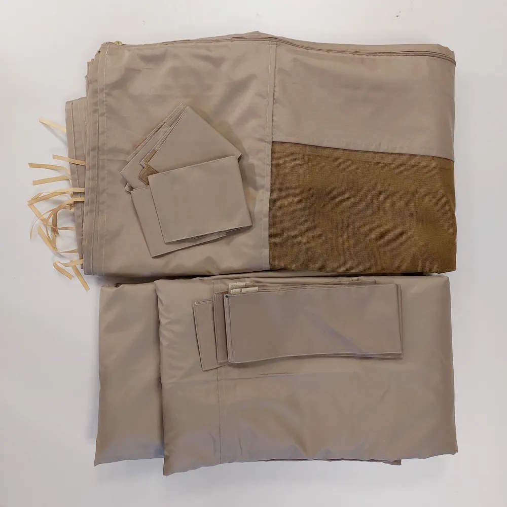 Преимущества используемого материала – ткани Оксфорд темно-бежевого цвета – долговечность, износостойкость, не восприимчивость к УФ-излучению, воде, ветру. Кроме того, ткань не пропускает насекомых, грязь и осадки. Такие свойства материала обеспечивает его особое переплетение, состав (хлопок, полиамид, нейлон, полиэстер) и покрытие полиуретана. Среди эстетических черт ткани Оксфорд отмечается глянцевый блеск, гладкость, плотность и мягкость готового изделия.