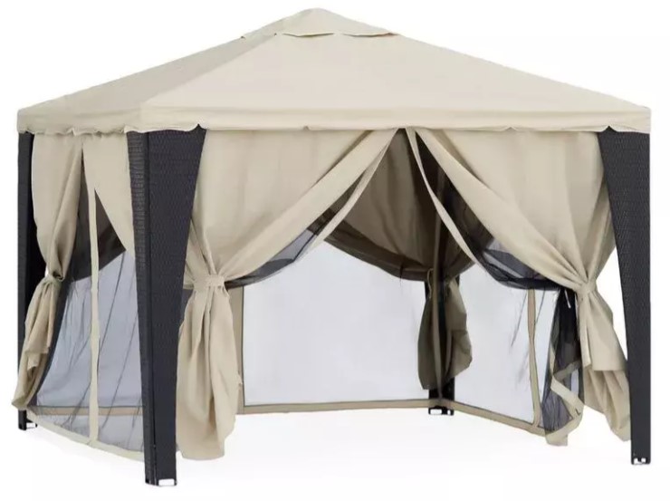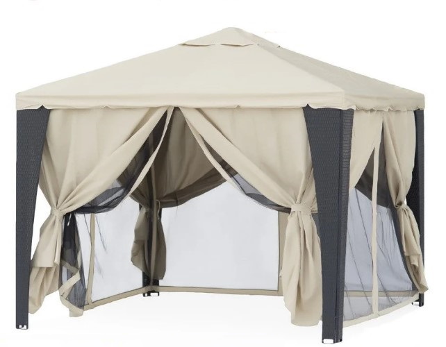 - Тентовый навес – отличная защита от трех главных негативных летних факторов: под ним не страшны докучливые насекомые, моросящий дождь и палящее солнце.