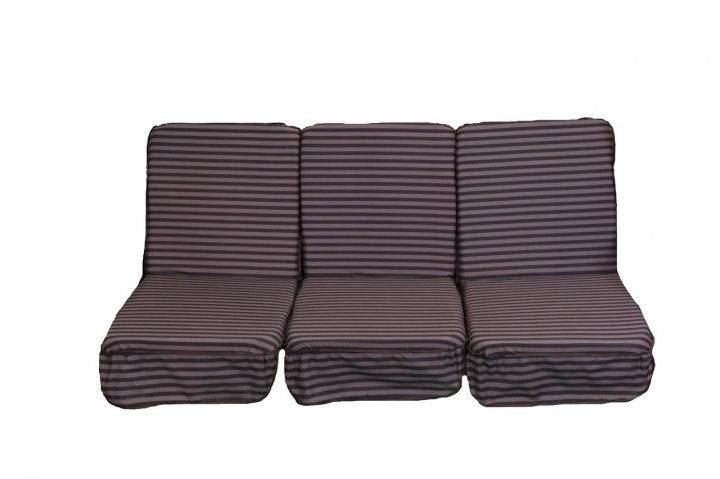 Это подушки, предназначенные для садовых качелей. Размер данной конструкции составляет 168 см, в это значение входят сразу три отдельные подушки. У каждой есть спинка и сидение, они соединены друг с другом. На верхней и нижней части располагаются змейки, благодаря этому чехлы снимаются при необходимости, а также стираются при помощи стиральной машины. Для того, чтобы эти подушки не спадали во время использования качели, по бокам располагаются специальные завязки, предназначенные для фиксации.